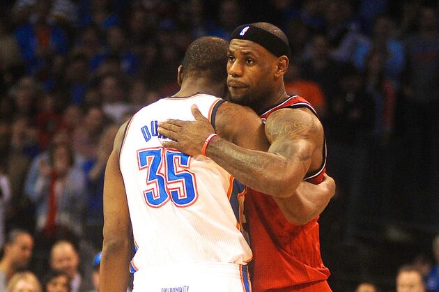 contested two-player duels in league history. In one corner, you have Miami Heat forward LeBron James, two-time reigning MVP, and four-time winner. In the other corner, you have Oklahoma City Thunder forward Kevin Durant, the 25-year-old upstart and runaway scoring title champ.
